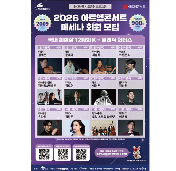 ÇÑÆí, À̹ø 2026³â ¾ÆÆ®¿¥ÄܼƮ ¶óÀξ÷Àº 1¿ù 15ÀÏ ±è¼¼ÁØ(ºñ¿Ã¶ó), 2¿ù 12ÀÏ ¹®Å±¹(ÿ·Î), 3¿ù 19ÀÏ ÃÖ¼ÛÇÏ(¹ÙÀ̿ø°), 4¿ù 16ÀÏ ºê·£µç ÃÖ(»ö¼ÒÆù), 5¿ù 14ÀÏ ±è¿µ¿í&¹ÚÀ¯½Å(¹ÙÀ̿ø°&ÿ·Î), 6¿ù 18ÀÏ ±èµµÇö(ÇǾƳë), 7¿ù 23ÀÏ ÀÌ¿µÀº(ÿ·Î), 8¿ù 13ÀÏ ±è»óÀ±(Ŭ¶ó¸®³Ý), 9¿ù 17ÀÏ À¯´ÙÀ±(¹ÙÀ̿ø°), 10¿ù 15ÀÏ ±èÁ¤Àº(ÇǾƳë), 11¿ù 19ÀÏ(¸ñ) ·Î¿ö ½ºÆ®¸µ Ä⸣ÅÝ(Çö¾Ç4ÁßÁÖ), 12¿ù 17ÀÏ(¸ñ) ÀÌÀ±¼®(Çϸð´ÏÄ«)ÀÌ ÇÔ²² ÇÒ ¿¹Á¤ÀÌ´Ù.